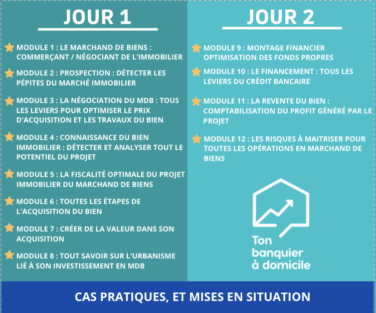 Ce sera l'occasion pour vous d'échanger en direct avec un ancien directeur d'agence marchand de biens d'un grand groupe bancaire français, de voir des cas concrets et des mises en situation vous permettant mettre en pratique immédiatement tous les conseils que vous aurez reçus.